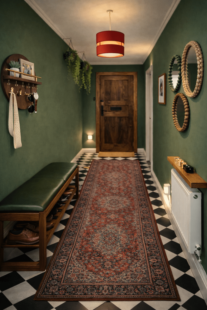 This hallway works because it’s cohesive without being matchy. Green, red, wood, and soft light all play nicely together. It feels calm, lived-in, and practical, which is honestly the goal.