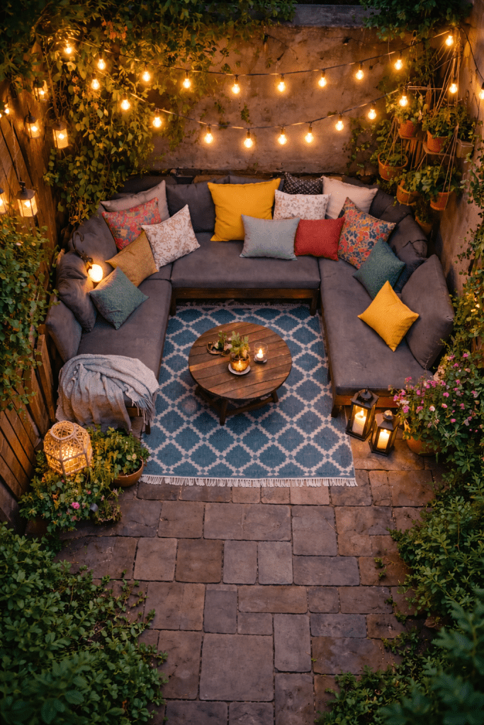 Overhead string lights are one of the most impactful elements in this look. Hung across the patio walls, they create a canopy effect that draws the eye upward and makes the space feel larger and more intimate at the same time.
