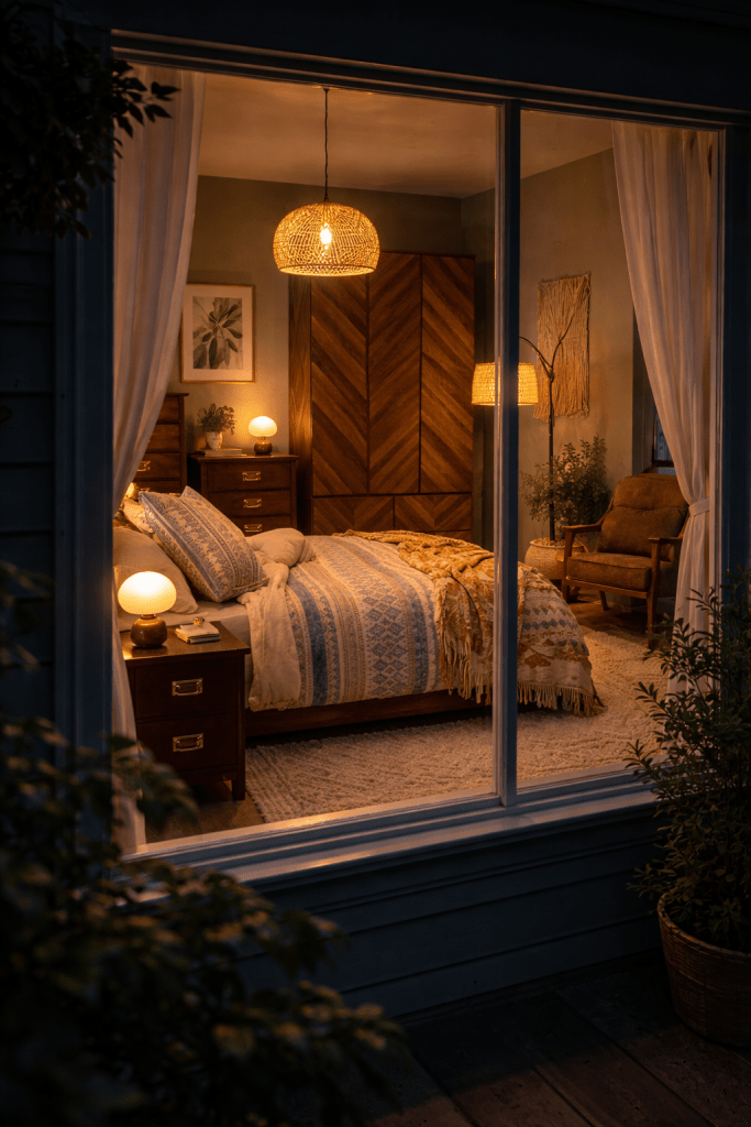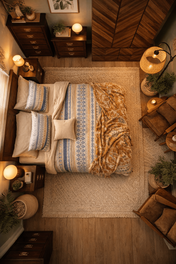 For a boho bedroom the feeling is warm, grounded, relaxed. So you repeat materials and tones. Dark wood. Soft woven textures. Warm lighting. Earthy colours.